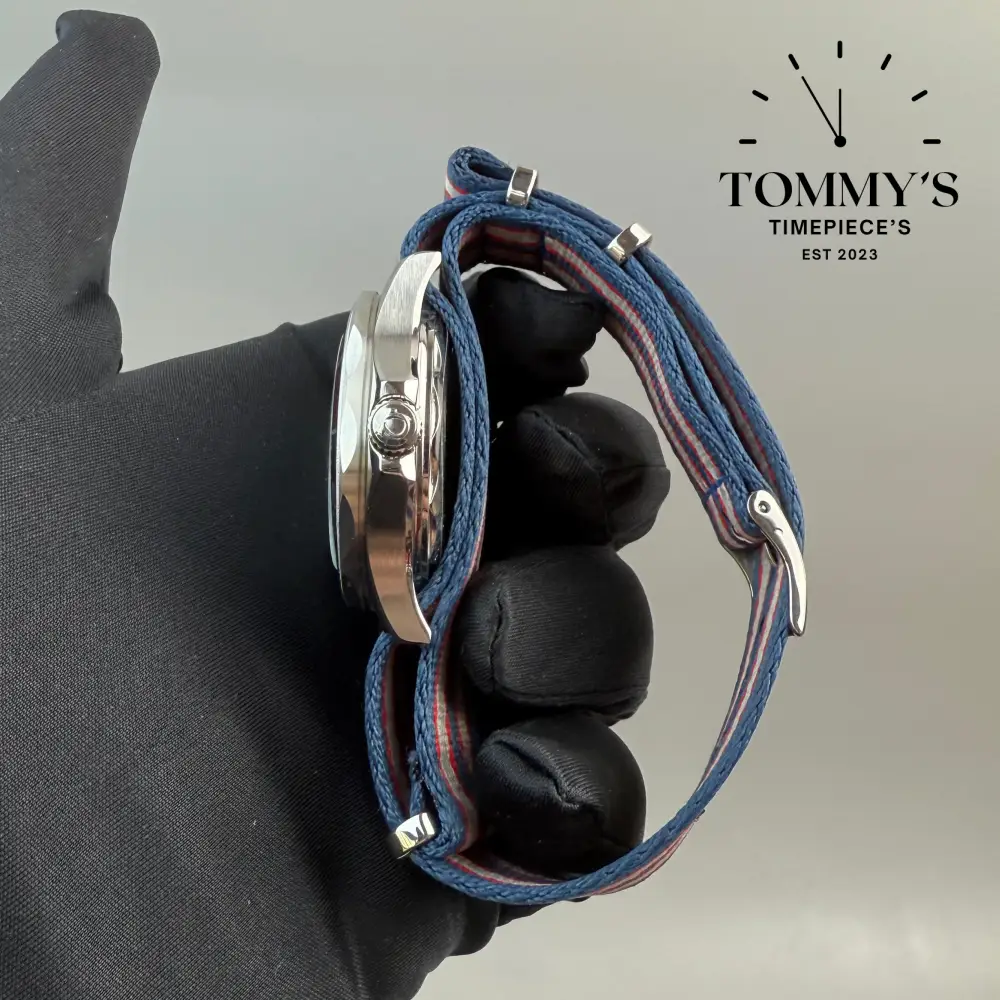 AAA+ Seamaster James Bond, 42mm White Ceramic Dial-Red Blue Grey NATO Strap (Blue Red Bezel)